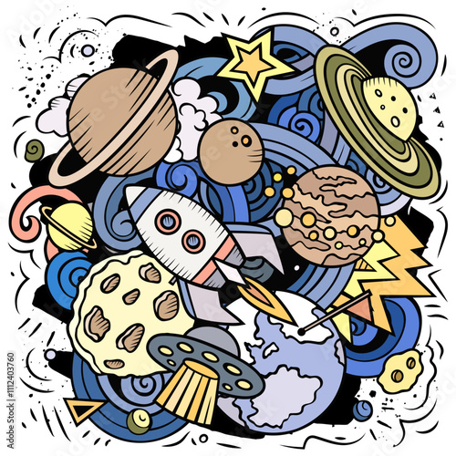 Space cartoon vector illustration. Funny detailed composition with a lot of Cosmos objects and symbols