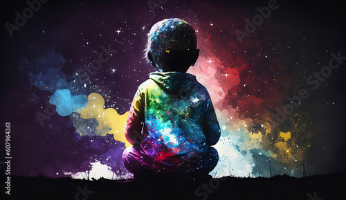 Space children meditate new quality of universal colorful technology illustration image design, generative