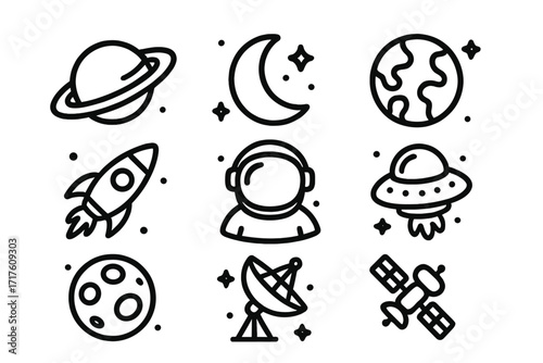 Space icon set vector line art. Collection of astronomy and universe symbols. Astronaut, rocket, planet, UFO, moon, satellite. Simple outline pictogram for web and app design.