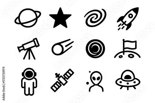 Space icons set: galaxy, astronaut, and ufo designs in linear style