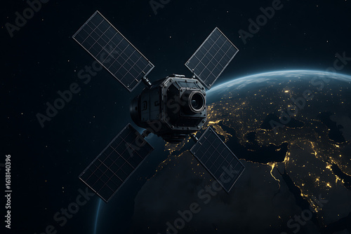 Space satellite with cross solar panels in orbit above europe at night showing geographic lights and atmospheric darkness for global tracking