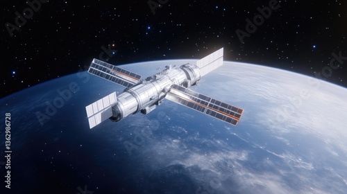 Space station orbiting Earth. A large, modern, complex space station with solar panels extends outward from a central body above Earth