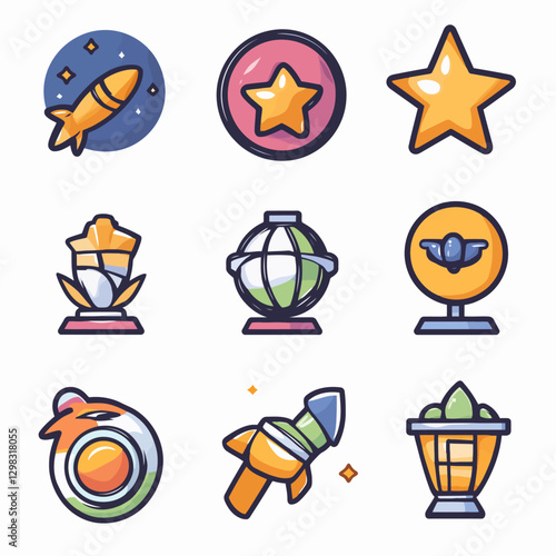 Space themed icon set featuring rockets stars and planets on white grid