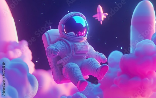 Space travel concept featuring a floating astronaut a spaceship takeoff and a 3D cartoon rendering of a ship in space presented as a collage art