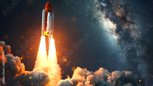 Spaceship takes off into the sky. Rocket starts into space. illustration