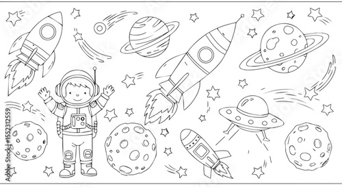 Space-Themed Coloring Page with Astronauts, Rockets, and Planets