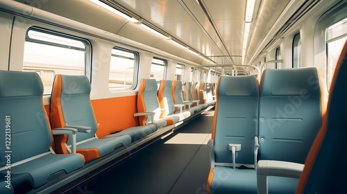 Spacious and Minimalist Interior of an Electric Train with Sleek Seating and Geometric Design for Comfortable Urban Commute and Public Transportation