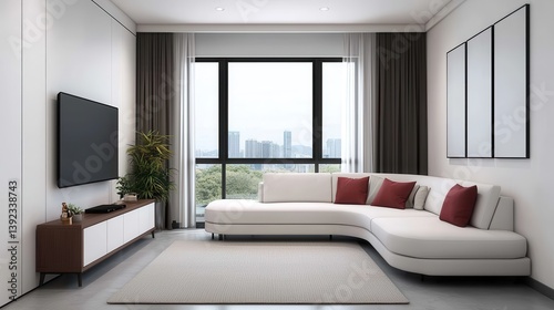 Spacious and minimalist living room with a sleek contemporary design and a stunning panoramic view of the city skyline