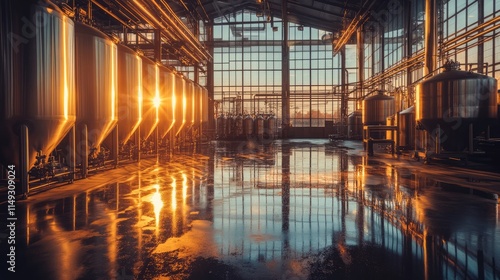 Spacious brewery interior with empty vats reflecting on the glossy floor at sunset