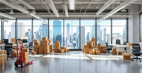 Spacious bright office full of cardboard boxes, desks, and chairs in front of large windows with cityscape background, concept of company relocation. Ai generative
