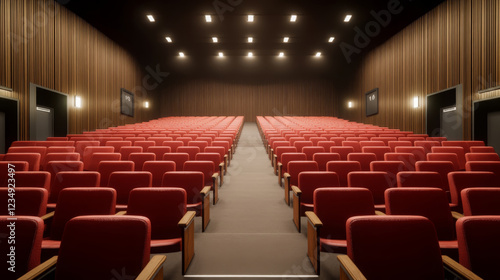 spacious cinema hall featuring rows of red seats, perfect for movie screenings. warm wooden walls and bright lights create inviting atmosphere for audiences
