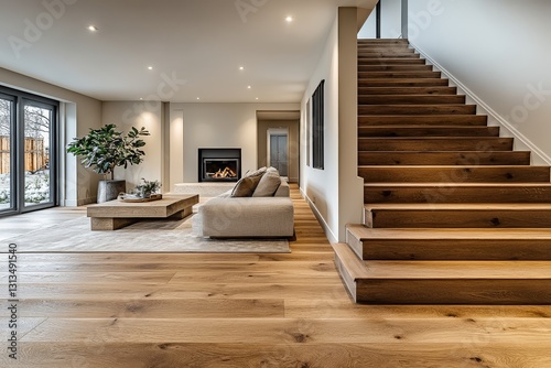Spacious Dutch-style living room with wooden floor, white walls, comfortable sofas, coffee table, fireplace, and staircase leading to upper level.