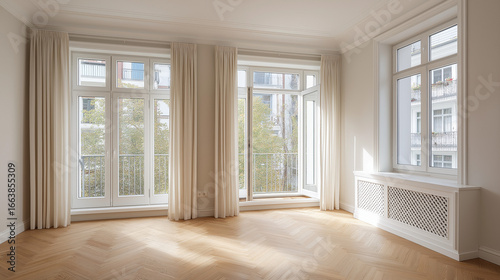 “Spacious Empty Living Room Interior – White Walls, Laminated Floor, and Balcony Doors”