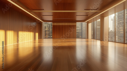 spacious, empty room with a pristine interior, offering a breathtaking view of a vibrant city skyline through large windows, symbolizing freedom, potential, and the beauty of urban life