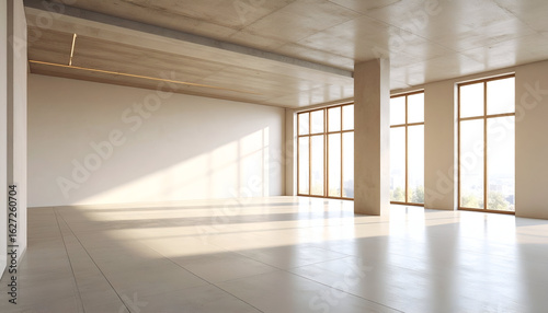 Spacious empty room with high ceilings, light concrete floor, and large windows casting warm afternoon light, ideal for a modern interior mockup.
