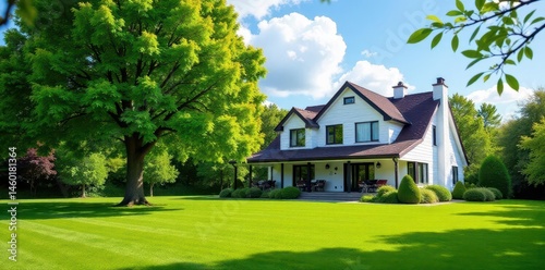 Spacious home, expansive lawn, majestic tree backdrop, suburban, sun
