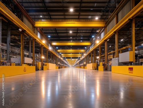 spacious industrial warehouse interior with bright lighting and yellow accents