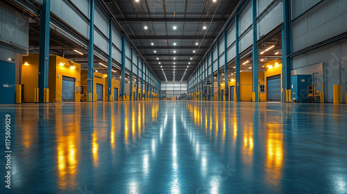 Spacious industrial warehouse interior with reflective flooring and bright lighting