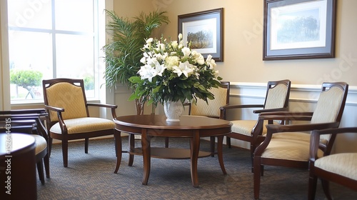 Spacious, inviting waiting area with comfortable seating and a centerpiece of white flowers