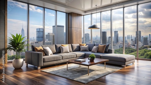 Spacious modern living room with sleek grey sofa, large windows, minimalist coffee table, and a stunning city skyline view behind.