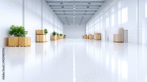Spacious, modern warehouse interior. Clean, bright, and well-organized space. Boxes and potted plants are strategically placed
