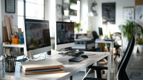 Spacious office desk in a bright environment with three monitors and clutter shot with a wide-angle lens