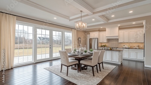 Spacious open-concept dining room overlooking backyard