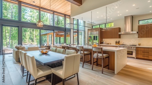 Spacious open-plan modern kitchen with a cozy dining area, elegant fixtures, and stylish barstools.