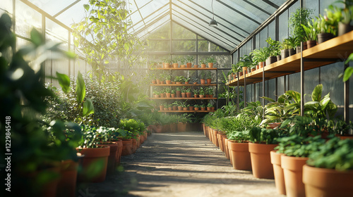 Spacious plant nursery with rows of green seedlings in terracotta and biodegradable pots under soft sunlight. High-resolution image perfect for eco-branding and gardening advertisements.