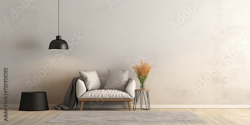 Spacious room with white decor, gray and black seating, wooden table, vase of flowers, lamp, carpet, and empty wall for design display.