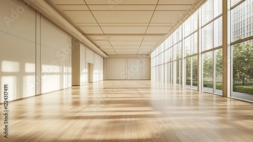 Spacious, sunlit empty hall with large windows and hardwood floor.