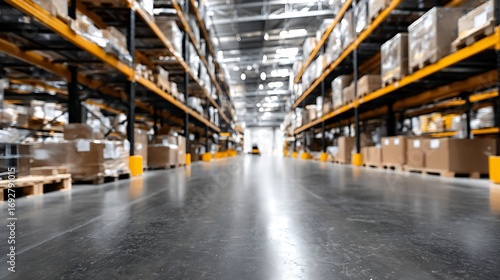 spacious warehouse aisle with rows of shelves filled with large cardboard boxes.