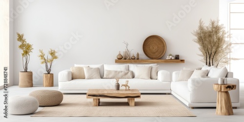 Spacious white living room with furniture, decor, and natural elements.