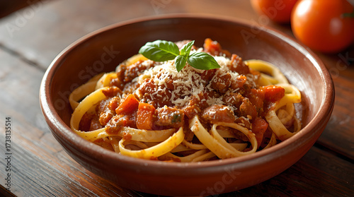 Spaghetti Bolognese with Tomato Sauce and Basil in Bowl