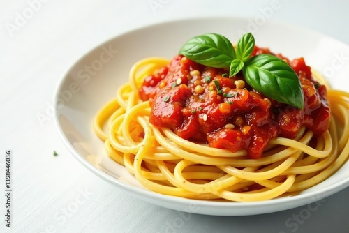 Spaghetti with fresh tomato sauce, basil, white background , culinary art, tomato