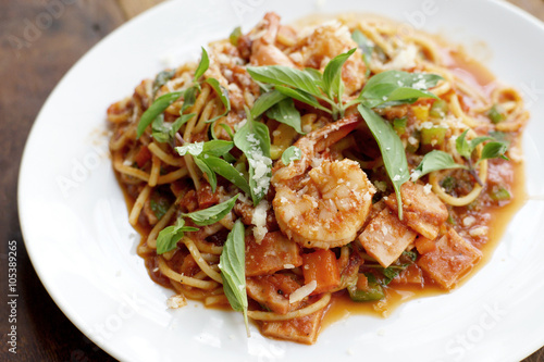 spaghetti with spicy prawn and ham