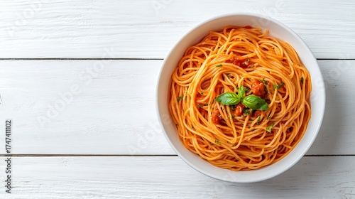 Spaghetti with Tomato Sauce and Basil in a White Bowl on Wood