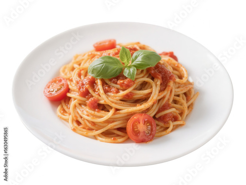 Spaghetti with Tomato Sauce, Basil, and Cherry Tomatoes on White Plate