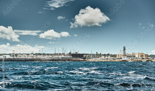 Spain, Formentera, 29 April 2018: The harbor of famous Formentera, a lighthouse, azure water, boats, sunny weather, without people
