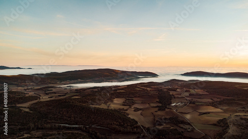 Spain, Province of Huesca, Estopinan del Castillo, Aerial panorama of mountains shrouded in sea of clouds at dusk
