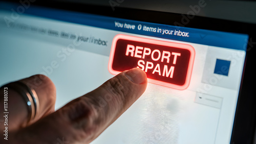 Spam call scam prevention concept. User pressing a "Report Spam" button on a touchscreen device.