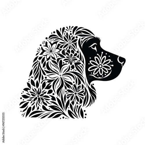 Spaniel dog made by simple flower drawing, black and white animal illustration
