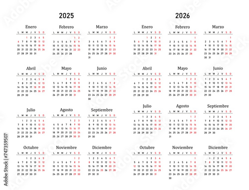 Spanish 2025, 2026 calendar with spanish holidays. Design template start from monday. Vector illustration