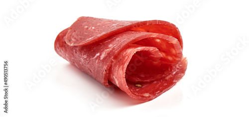 Spanish salchichon sausage, isolated on white background.