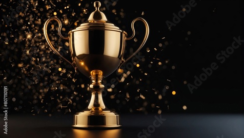 Sparkles black background with a winners cup. Champion golden trophy on black background. Concept of success and achievement.
