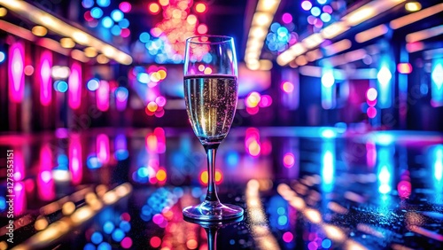 Sparkling Champagne Glass in Neon Nightclub - Luxury Party Scene