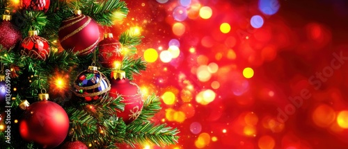 Sparkling Christmas Tree Ornaments and Red Festive Background