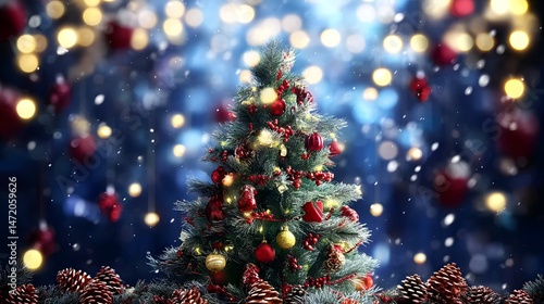 Sparkling Christmas Tree with Ornaments and Snowflakes in a Magical Holiday Setting