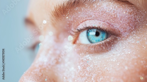 Sparkling close-up of a blue eye adorned with shimmering glitter under natural light