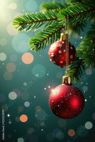 Sparkling crystal ornaments hang from evergreen branch, ornament, evergreen, crystal